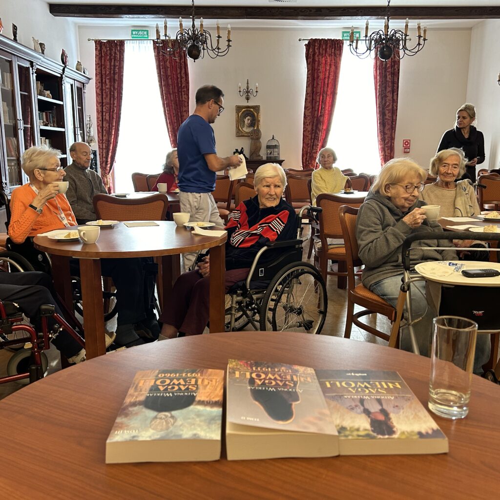 7 października odbyło się spotkanie w Domu Powstańców Warszawskich na Nowolipie 12, gdzie w ciągu dnia przebywają byli uczestnicy tego zrywu bohaterskiego. Pojechaliśmy tam, aby Aldona Wleklak, autorka Sagi Niewoli zrobiła wykład „Jak szukamy przodków”, a aktorka Magdalena Waligórska przeczytała dwa fragmenty powieści historycznej. Potem uczestnicy tego wydarzenia sami opowiadali swoje historię. Pan Stefan zwierzył się, że w mieszkaniu jego rodziców odbywały się tajne spotkania, gdzie na pianinie grali tylko Chopina, który był w tym czasie zakazany.