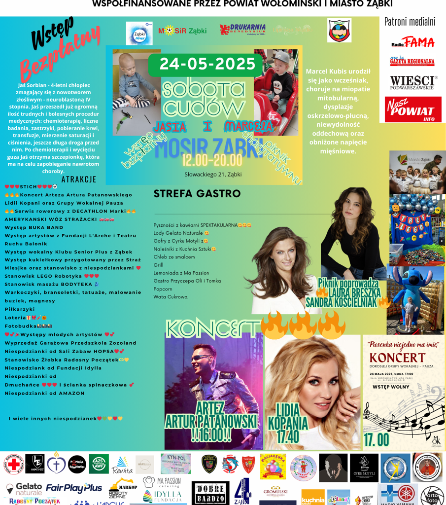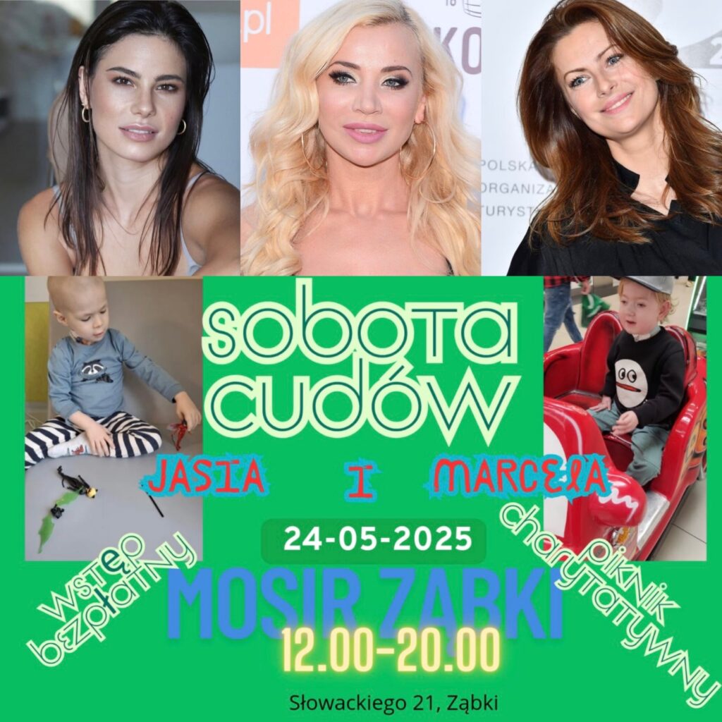 W dniu 24 maja słoneczną sobotę odbył się piknik charytatywny w Ząbkach: „Sobota Cudów Jasia i Marcela” w Miejskim Ośrodku Sportu. Wszystko po to aby, uzbierać pieniądze dla dwóch chorych chłopców. Jasiek nie mógł uczestniczyć w tym wydarzeniu, bo nie pozwolił mu na to stan zdrowia. Natomiast był Marcelek, który jest chory na miopatię miotubularną, więc jedynym ratunkiem dla niego jest systematyczna i niestety kosztowna rehabilitacja. W ramach tego pikniku odbywały się występy taneczne dzieci Buka Band, na scenie zaśpiewał też Artez Artur Patynowski. Również artyści z Fundacji L’ Arche i Teatru Ruchu Balonik i z Klubu Senior Plus z Ząbek. Był występ kukiełkowy przygotowany przez Straż Miejską. Pomagały w organizacji, ale i prowadziły tą imprezę dwie aktorki Laura Breszka i Sandra Kościelniak. Zapewniono wiele atrakcji dla najmłodszych. Dzieci mogły pobawić się na placu zabaw, skorzystać ze ścianki wspinaczkowej, a dowolne datki były zbierane do puszki. Można było skosztować naleśniki oraz gofry, ale i kiełbaskę z grilla. Przygotowano stanowiska, aby zrobić sobie warkoczyki Bransoletki, Tatuaże, malowanie buziek. Była loteria piłkarzyki i foto budka i wiele innych atrakcji. Prowadzące licytowały różne gadżety, aby zebrać pieniądze dla dwóch chorych chłopców.